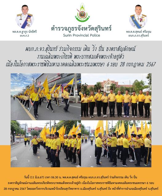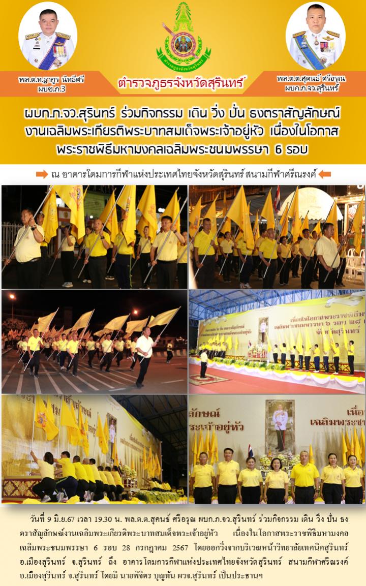 10 มิ.ย. 2567 08:34:21ผบก.ภ.จว.สุรินทร์ ร่วมกิจกรรม เดิน วิ่ง ปั่น ธงตราสัญลักษณ์ งานเฉลิมพระเกียรติพระบาทสมเด็จพระเจ้าอยู่หัว เนื่องในโอกาสพระราชพิธีมหามงคลเฉลิมพระชนมพรรษา 6 รอบ วันที่ 9 มิ.ย.67 เวลา 19.30 น. พล.ต.ต.สุคนธ์ ศรีอรุณ ผบก.ภ.จว.สุรินทร์ ร่วมกิจกรรม เดิน วิ่ง ปั่น ธงตราสัญลักษณ์งานเฉลิมพระเกียรติพระบาทสมเด็...
