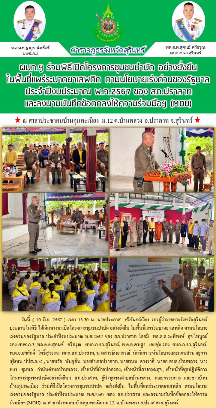 10 มิ.ย. 2567 19:31:14ผบก.ฯ ร่วมพิธีเปิดโครงการชุมชนบำบัด อย่างยั่งยืน ในพื้นที่แพร่ระบาดยาเสพติด ตามนโยบายเร่งด่วนของรัฐบาล ประจำปีงบประมาณ พ.ศ.2567 ของ สภ.ปราสาท และลงนามบันทึกข้อตกลงให้ความร่วมมือฯ (MOU) วันนี้ ( 10 มิ.ย. 2567 ) เวลา 13.30 น. นายประภาส ศรีจันทร์เวียง รองผู้ว่าราชการจังหวัดสุรินทร์ ประธานในพิธี ได...