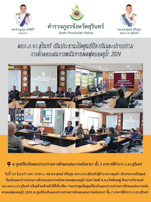 14 มิ.ย. 2567 11:12:45ผบก.ภ.จว.สุรินทร์ เป็นประธานเปิดศูนย์ป้องกันและปราบปราม การลักลอบเล่นการพนันทายผลฟุตบอลยูโร 2024 วันนี้ (14 มิ.ย.67) เวลา 10.00 น. พล.ต.ต.สุคนธ์ ศรีอรุณ ผบก.ภ.จว.สุรินทร์/ผู้อำนวยการศูนย์ฯ เป็นประธานเปิดศูนย์ ป้องกันและปราบปรามการลักลอบเล่นการพนันทายผลฟุตบอลยูโร 2024 โดยมี พ.ต.อ.กิตติเชษฐ์ ศักยภาพว...