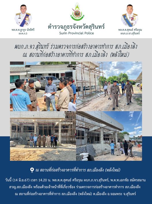 16 มิ.ย. 2567 12:16:55ผบก.ฯ ร่วมตรวจการก่อสร้างอาคารทำการ สภ.เมืองลีง (หลังใหม่) วันที่ 14 มิ.ย.67 เวลา 14.20 น. พล.ต.ต.สุคนธ์ ศรีอรุณ ผบก.ภ.จว.สุรินทร์, พ.ต.ท.เอกชัย สมัครสมาน สวญ.สภ.เมืองลีง พร้อมด้วยเจ้าหน้าที่ที่เกี่ยวข้อง ร่วมตรวจการก่อสร้างอาคารทำการ สภ.เมืองลีง ณ สถานที่ก่อสร้างอาคารที่ทำการ สภ.เมืองลีง (หลังให...
