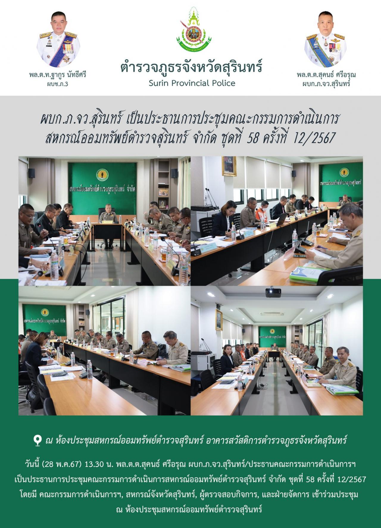 28 พ.ค. 2567 15:25:23ผบก.ภ.จว.สุรินทร์ เป็นประธานการประชุมคณะกรรมการดำเนินการ สหกรณ์ออมทรัพย์ตำรวจสุรินทร์ จำกัด ชุดที่ 58 ครั้งที่ 12/2567 วันนี้ (28 พ.ค.67) 13.30 น. พล.ต.ต.สุคนธ์ ศรีอรุณ ผบก.ภ.จว.สุรินทร์/ประธานคณะกรรมการดำเนินการฯ เป็นประธานการประชุมคณะกรรมการดำเนินการสหกรณ์ออมทรัพย์ตำรวจสุรินทร์ จำกัด ชุดที่ 58 ...