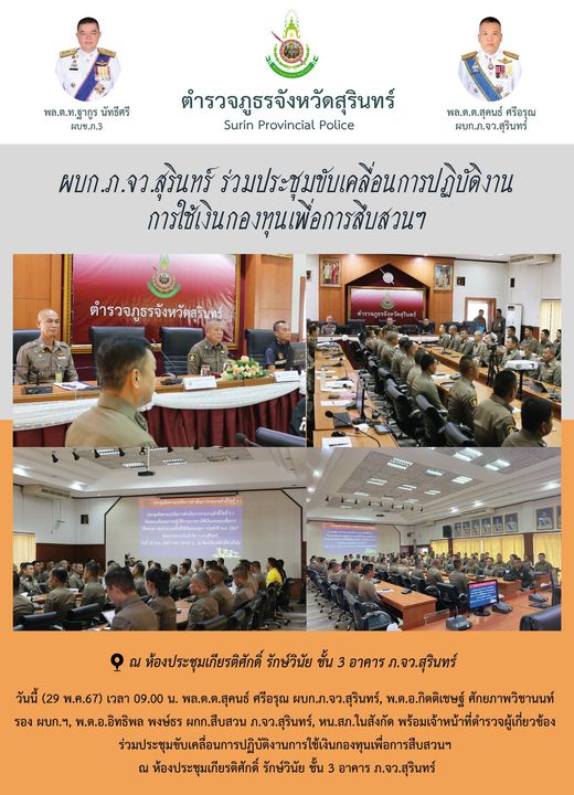 29 พ.ค. 2567 10:56:39ผบก.ภ.จว.สุรินทร์ ร่วมประชุมขับเคลื่อนการปฏิบัติงาน การใช้เงินกองทุนเพื่อการสืบสวนฯ วันนี้ (29 พ.ค.67) เวลา 09.00 น. พล.ต.ต.สุคนธ์ ศรีอรุณ ผบก.ภ.จว.สุรินทร์, พ.ต.อ.กิตติเชษฐ์ ศักยภาพวิชานนท์ รอง ผบก.ฯ, พ.ต.อ.อิทธิพล พงษ์ธร ผกก.สืบสวน ภ.จว.สุรินทร์, หน.สภ.ในสังกัด พร้อมเจ้าหน้าที่ตำรวจผู้เกี่ยวข้อง ...
