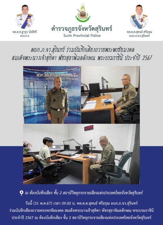 31 พ.ค. 2567 10:14:51ผบก.ภ.จว.สุรินทร์ ร่วมบันทึกเสียงถวายพระพรชัยมงคล สมเด็จพระนางเจ้าสุทิดา พัชรสุธาพิมลลักษณ พระบรมราชินี ประจำปี 2567 วันนี้ (31 พ.ค.67) เวลา 09.00 น. พล.ต.ต.สุคนธ์ ศรีอรุณ ผบก.ภ.จว.สุรินทร์ ร่วมบันทึกเสียงถวายพระพรชัยมงคล สมเด็จพระนางเจ้าสุทิดา พัชรสุธาพิมลลักษณ พระบรมราชินี ประจำปี 2567 ณ ห้องบัน...