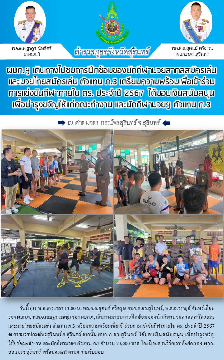 31 พ.ค. 2567 16:38:48ผบก.ฯ เดินทางไปชมการฝึกซ้อมของนักกีฬามวยสากลสมัครเล่น และมวยไทยสมัครเล่น ตัวแทน ภ.3 เตรียมความพร้อมเพื่อเข้าร่วมการแข่งขันกีฬาภายใน ตร. ประจำปี 2567 ได้มอบเงินสนับสนุน เพื่อบำรุงขวัญให้แก่คณะทำงาน และนักกีฬามวยฯ ตัวแทน ภ.3 วันนี้ (31 พ.ค.67) เวลา 13.00 น. พล.ต.ต.สุคนธ์ ศรีอรุณ ผบก.ภ.จว.สุรินทร์, พ...