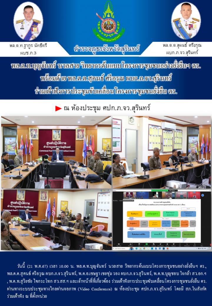21 พ.ค. 2567 15:32:43 พล.ต.ท.บุญจันทร์ นวลสาย วิทยากรต้นแบบโครงการชุมชนอย่างยั่งยืนฯ ตร. พร้อมด้วย พล.ต.ต.สุคนธ์ ศรีอรุณ ผบก.ภ.จว.สุรินทร์ ร่วมเฝ้าฟังการประชุมขับเคลื่อนโครงการชุมชนยั่งยืน ตร. วันนี้ (21 พ.ค.67) เวลา 10.00 น. พล.ต.ท.บุญจันทร์ นวลสาย วิทยากรต้นแบบโครงการชุมชนอย่างยั่งยืนฯ ตร., พล.ต.ต.สุคนธ์ ศรีอรุณ ผบก....