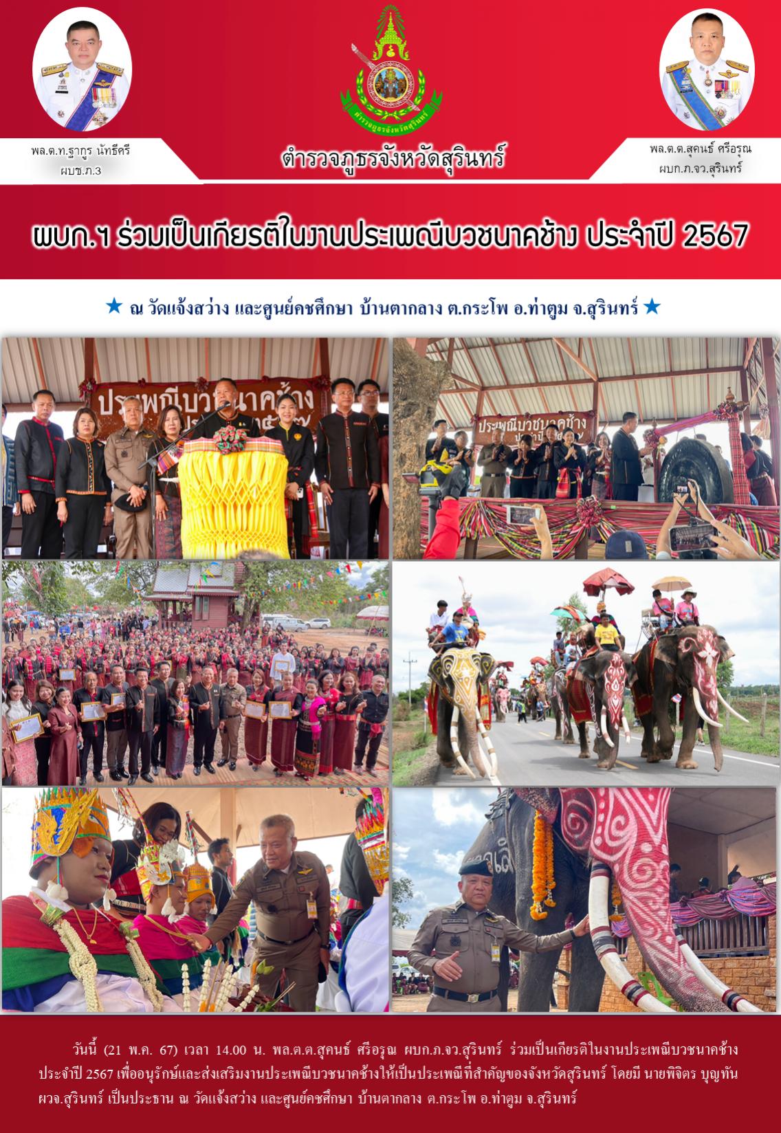 21 พ.ค. 2567 17:21:45ผบก.ฯ ร่วมเป็นเกียรติในงานประเพณีบวชนาคช้าง ประจำปี 2567 วันนี้ (21 พ.ค. 67) เวลา 14.00 น. พล.ต.ต.สุคนธ์ ศรีอรุณ ผบก.ภ.จว.สุรินทร์ ร่วมเป็นเกียรติในงานประเพณีบวชนาคช้าง ประจำปี 2567 เพื่ออนุรักษ์และส่งเสริมงานประเพณีบวชนาคช้างให้เป็นประเพณีที่สำคัญของจังหวัดสุรินทร์ โดยมี นายพิจิตร บุญทัน ผวจ.สุริน...