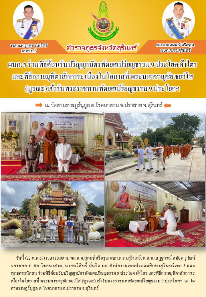 22 พ.ค. 2567 21:35:03ผบก.ฯ ร่วมพิธีต้อนรับปริญญาบัตรพัดยศเปรียญธรรม 9 ประโยค ผ้าไตร และพิธีถวายมุทิตาสักการะ เนื่องในโอกาสที่ พระมหาชาญชัย ชยวํโส (บูรณะ) เข้ารับพระราชทานพัดยศเปรียญธรรม 9 ประโยคฯ วันนี้ (22 พ.ค.67) เวลา 10.09 น. พล.ต.ต.สุคนธ์ ศรีอรุณ ผบก.ภ.จว.สุรินทร์, พ.ต.ท.เสฎฐกรณ์ สมัยจารุวัฒน์ รองผกก.ป.สภ.โช...