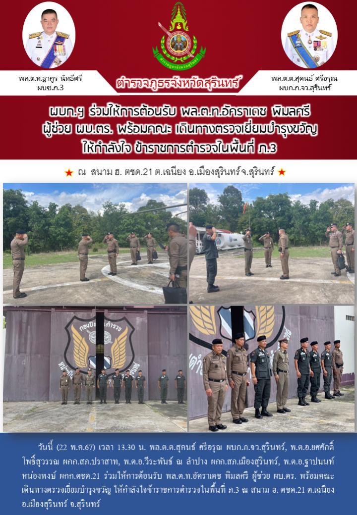 22 พ.ค. 2567 21:35:09ผบก.ฯ ร่วมให้การต้อนรับ พล.ต.ท.อัคราเดช พิมลศรี ผู้ช่วย ผบ.ตร. พร้อมคณะ เดินทางตรวจเยี่ยมบำรุงขวัญ ให้กำลังใจข้าราชการตำรวจในพื้นที่ ภ.3 วันนี้ (22 พ.ค.67) เวลา 13.30 น. พล.ต.ต.สุคนธ์ ศรีอรุณ ผบก.ภ.จว.สุรินทร์, พ.ต.อ.ยศศักดิ์ โพธิ์สุวรรณ ผกก.สภ.ปราสาท, พ.ต.อ.วีระพันธ์ ณ ลำปาง ผกก.สภ.เมืองสุรินทร์...