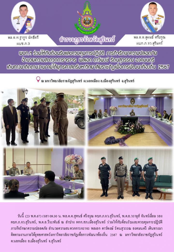 23 พ.ค. 2567 16:31:52ผบก.ฯ ร่วมให้กับต้อนรับและควบคุมการปฏิบัติภารกิจรักษาความปลอดภัย อำนวยความสะดวกการจราจร พลเอก ดาว์พงษ์ รัตนสุวรรณ องคมนตรี เดินทางมาติดตามงานภายใต้ยุทธศาสตร์มหาวิทยาลัยราชภัฏเพื่อการพัฒนาท้องถิ่น 2567 วันนี้ (23 พ.ค.67) เวลา 09.30 น. พล.ต.ต.สุคนธ์ ศรีอรุณ ผบก.ภ.จว.สุรินทร์, พ.ต.อ.วรายุส์ จันทร์เยี่...
