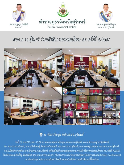 1 พ.ค. 2567 15:08:56ผบก.ภ.จว.สุรินทร์ ร่วมเฝ้าฟังการประชุมบริหาร ตร. ครั้งที่ 4/2567 วันนี้ (1 พ.ค.67) เวลา 13.30 น. พล.ต.ต.สุคนธ์ ศรีอรุณ ผบก.ภ.จว.สุรินทร์, พ.ต.อ.ศิราเมษฐ์ ธานินพิทักษ์ รอง ผบก.ภ.จว.สุรินทร์, พ.ต.อ.กิตติเชษฐ์ ศักยภาพวิชานนท์ รอง ผบก.ภ.จว.สุรินทร์, พ.ต.อ.เชษฐา เชยชุ่ม รอง ผบก.ภ.จว.สุรินทร์, พ.ต.อ.อิ...