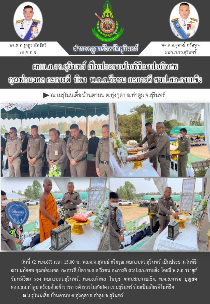 2 พ.ค. 2567 16:28:51 ผบก.ภ.จว.สุรินทร์ เป็นประธานในพิธีฌาปนกิจศพ คุณพ่อมงคล กะการดี บิดา พ.ต.ต.วีรชน กะการดี สวป.สภ.กาบเชิง วันนี้ (2 พ.ค.67) เวลา 15.00 น. พล.ต.ต.สุคนธ์ ศรีอรุณ ผบก.ภ.จว.สุรินทร์ เป็นประธานในพิธีฌาปนกิจศพ คุณพ่อมงคล กะการดี บิดา พ.ต.ต.วีรชน กะการดี สวป.สภ.กาบเชิง โดยมี พ.ต.อ.วรายุส์ จันทร์...