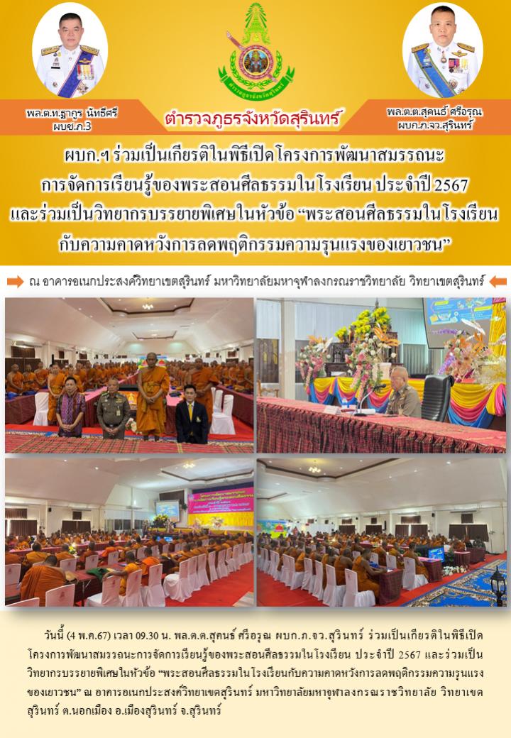 4 พ.ค. 2567 19:16:45ผบก.ฯ ร่วมเป็นเกียรติในพิธีเปิดโครงการพัฒนาสมรรถนะ การจัดการเรียนรู้ของพระสอนศีลธรรมในโรงเรียน ประจำปี 2567 และร่วมเป็นวิทยากรบรรยายพิเศษในหัวข้อ “พระสอนศีลธรรมในโรงเรียนกับความคาดหวังการลดพฤติกรรมความรุนแรงของเยาวชน” วันนี้ (4 พ.ค.67) เวลา 09.30 น. พล.ต.ต.สุคนธ์ ศรีอรุณ ผบก.ภ.จว.สุรินทร์ ร่...