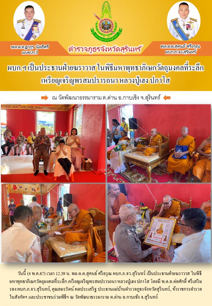 4 พ.ค. 2567 19:16:50ผบก.ฯ เป็นประธานฝ่ายฆราวาส ในพิธีมหาพุทธาภิเษกวัตถุมงคลที่ระลึก เหรียญเจริญพรสมปรารถนา หลวงปู่เฮง ปภาโส วันนี้ (4 พ.ค.67) เวลา 12.39 น. พล.ต.ต.สุคนธ์ ศรีอรุณ ผบก.ภ.จว.สุรินทร์ เป็นประธานฝ่ายฆราวาส ในพิธีมหาพุทธาภิเษกวัตถุมงคลที่ระลึก เหรียญเจริญพรสมปรารถนา หลวงปู่เฮง ปภาโส โดยมี พ.ต.อ.ต่อศั...
