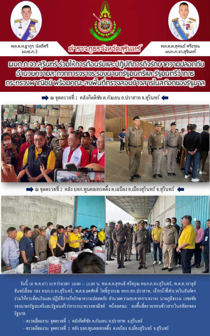 6 พ.ค. 2567 17:34:04ผบก.ภ.จว.สุรินทร์ ร่วมให้การต้อนรับและปฏิบัติภารกิจรักษาความปลอดภัย อำนวยความสะดวกการจราจร รองนายกรัฐมนตรีและรัฐมนตรีว่าการกระทรวงพาณิชย์ พร้อมคณะ ลงพื้นที่ตรวจสอบข้าวสารในสต๊อกของรัฐบาล วันนี้ (6 พ.ค.67) ระหว่างเวลา 10.00 – 15.00 น. พล.ต.ต.สุคนธ์ ศรีอรุณ ผบก.ภ.จว.สุรินทร์, พ.ต.อ.วรายุส์ จันทร์เยี...