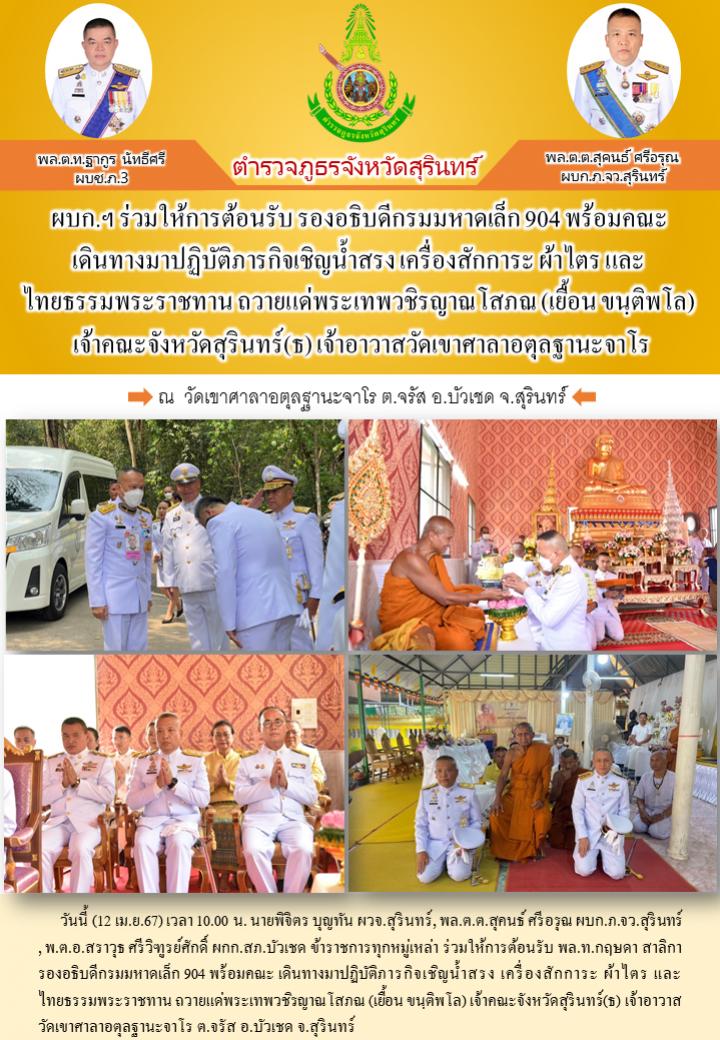 12 เม.ย. 2567 15:44:22 ผบก.ฯ ร่วมให้การต้อนรับ รองอธิบดีกรมมหาดเล็ก 904 พร้อมคณะ เดินทางมาปฏิบัติภารกิจเชิญน้ำสรง เครื่องสักการะ ผ้าไตร และไทยธรรมพระราชทาน ถวายแด่พระเทพวชิรญาณโสภณ (เยื้อน ขนฺติพโล) เจ้าคณะจังหวัดสุรินทร์(ธ) เจ้าอาวาสวัดเขาศาลาอตุลฐานะจาโร วันนี้ (12 เม.ย.67) เวลา 10.00 น. นายพิจิตร บุญทัน ผวจ.สุรินทร์,...