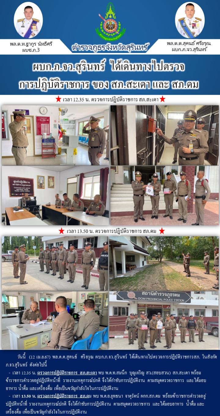 12 เม.ย. 2567 21:10:31ผบก.ภ.จว.สุรินทร์ ได้เดินทางไปตรวจการปฏิบัติราชการ ของ สภ.สะเดา และ สภ.ดม วันนี้ (12 เม.ย.67) พล.ต.ต.สุคนธ์ ศรีอรุณ ผบก.ภ.จว.สุรินทร์ ได้เดินทางไปตรวจการปฏิบัติราชการสภ. ในสังกัด ภ.จว.สุรินทร์ ดังต่อไปนี้ - เวลา 12.35 น. ตรวจการปฏิบัติราชการ สภ.สะเดา พบ พ.ต.ท.สมนึก บุญเจริญ สว.(สอบสวน) ส...