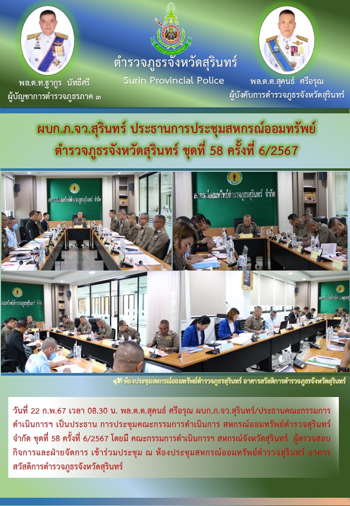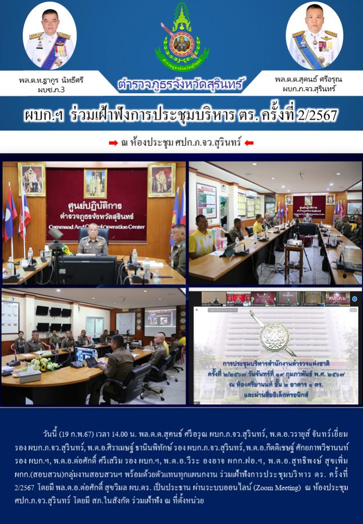 19 ก.พ. 2567 16:35:38ผบก.ฯ ร่วมเฝ้าฟังการประชุมบริหาร ตร. ครั้งที่ 2/2567 วันนี้ (19 ก.พ.67) เวลา 14.00 น. พล.ต.ต.สุคนธ์ ศรีอรุณ ผบก.ภ.จว.สุรินทร์, พ.ต.อ.วรายุส์ จันทร์เยี่ยม รอง ผบก.ภ.จว.สุรินทร์, พ.ต.อ.ศิราเมษฐ์ ธานินพิทักษ์ รอง ผบก.ภ.จว.สุรินทร์, พ.ต.อ.กิตติเชษฐ์ ศักยภาพวิชานนท์ รอง ผบก.ฯ, พ.ต.อ.ต่อศั...