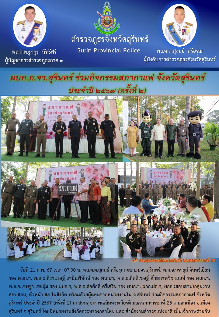 21 ก.พ. 2567 13:27:28 กิจกรรมสภากาแฟ จังหวัดสุรินทร์ ประจำปี 2567 (ครั้งที่ 2) วันนี้ (21 ก.พ. 67) เวลา 07.00 น. พล.ต.ต.สุคนธ์ ศรีอรุณ ผบก.ภ.จว.สุรินทร์, พ.ต.อ.วรายุส์ จันทร์เยี่ยม รอง ผบก.ฯ, พ.ต.อ.ศิราเมษฐ์ ธานินพิทักษ์ รอง ผบก.ฯ, พ.ต.อ.กิตติเชษฐ์ ศักยภาพวิชานนท์ รอง ผบก.ฯ, พ.ต.อ.เชษฐา เชยชุ่ม รอง ผบก.ฯ, พ.ต.อ.ต่อศัก...