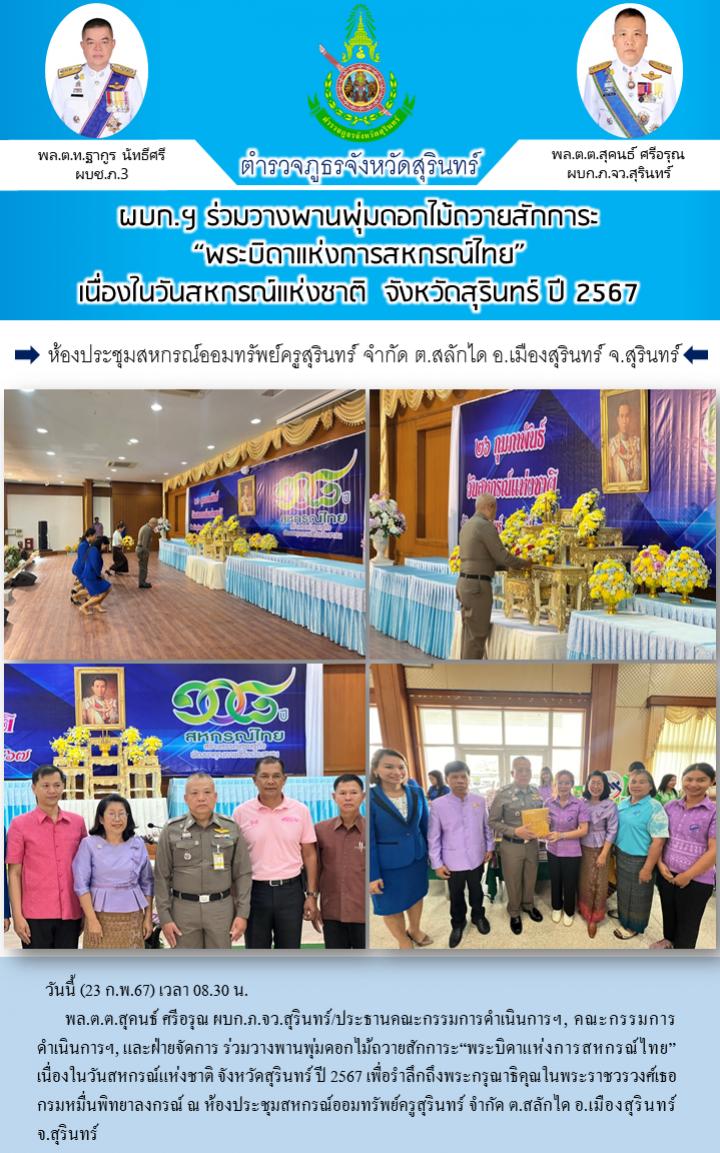 23 ก.พ. 2567 11:51:16 ผบก.ฯ ร่วมวางพานพุ่มดอกไม้ถวายสักการะ“พระบิดาแห่งการสหกรณ์ไทย” เนื่องในวันสหกรณ์แห่งชาติ จังหวัดสุรินทร์ ปี 2567 วันนี้ (23 ก.พ.67) เวลา 08.30 น. พล.ต.ต.สุคนธ์ ศรีอรุณ ผบก.ภ.จว.สุรินทร์/ประธานคณะกรรมการดำเนินการฯ, คณะกรรมการดำเนินการฯ, และฝ่ายจัดการ ร่วมวางพานพุ่มดอกไม้ถวายสักการะ“พระบิดาแห่งการ...