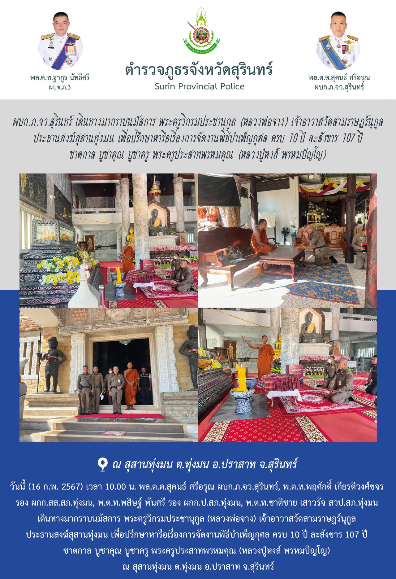 16 ก.พ. 2567 14:18:10ผบก.ภ.จว.สุรินทร์ เดินทางมากราบนมัสการ พระครูวิกรมประชานุกูล (หลวงพ่อจาง) เจ้าอาวาสวัดสามราษฎร์นุกูล ประธานสงฆ์สุสานทุ่งมน เพื่อปรึกษาหารือเรื่องการจัดงานพิธีบำเพ็ญกุศล ครบ 10 ปี ละสังขาร 107 ปี ชาตกาล บูชาคุณ บูชาครู พระครูประสาทพรหมคุณ (หลวงปู่หงส์ พรหมปัญโญ) วันนี้ (16 ก.พ. 2567) เวลา 10.00 น. พ...