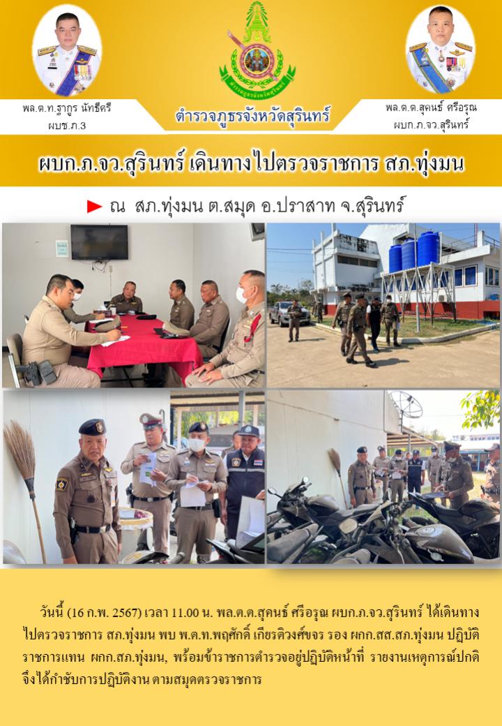 16 ก.พ. 2567 14:51:25ผบก.ภ.จว.สุรินทร์ เดินทางไปตรวจราชการ สภ.ทุ่งมน วันนี้ (16 ก.พ. 2567) เวลา 11.00 น. พล.ต.ต.สุคนธ์ ศรีอรุณ ผบก.ภ.จว.สุรินทร์ ได้เดินทางไปตรวจราชการ สภ.ทุ่งมน พบ พ.ต.ท.พฤศักดิ์ เกียรติวงศ์ขจร รอง ผกก.สส.สภ.ทุ่งมน ปฏิบัติราชการแทน ผกก.สภ.ทุ่งมน, พร้อมข้าราชการตำรวจอยู่ปฏิบัติหน้าที่ รายงานเหตุการณ์ปกต...