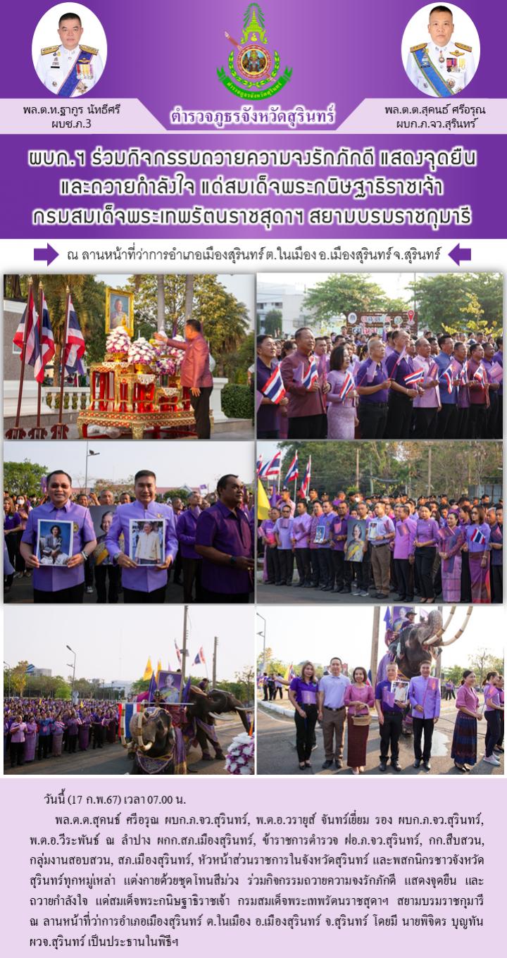 17 ก.พ. 2567 12:10:41ผบก.ฯ ร่วมกิจกรรมถวายความจงรักภักดี แสดงจุดยืน และถวายกำลังใจ แด่สมเด็จพระกนิษฐาธิราชเจ้า กรมสมเด็จพระเทพรัตนราชสุดาฯ สยามบรมราชกุมารี วันนี้ (17 ก.พ.67) เวลา 07.00 น. พล.ต.ต.สุคนธ์ ศรีอรุณ ผบก.ภ.จว.สุรินทร์, พ.ต.อ.วรายุส์ จันทร์เยี่ยม รอง ผบก.ภ.จว.สุรินทร์, พ.ต.อ.วีระพันธ์ ณ ลำปาง ผกก.สภ...