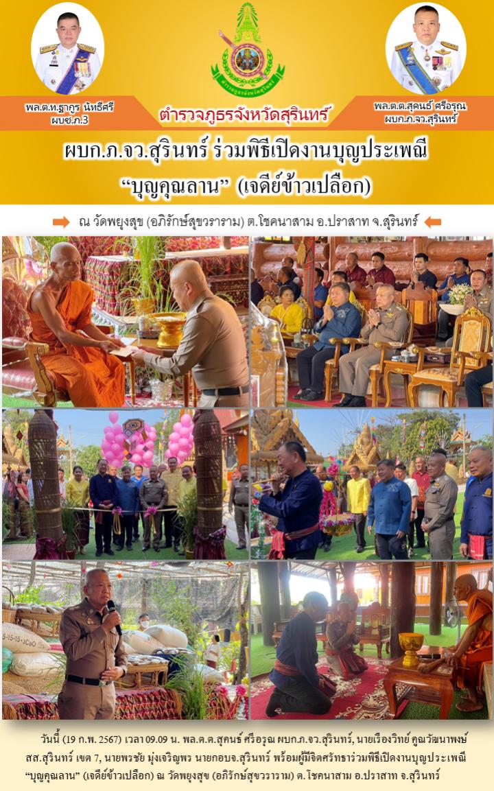 19 ก.พ. 2567 16:35:32ผบก.ภ.จว.สุรินทร์ ร่วมพิธีเปิดงานบุญประเพณี “บุญคุณลาน” (เจดีย์ข้าวเปลือก) วันนี้ (19 ก.พ. 2567) เวลา 09.09 น. พล.ต.ต.สุคนธ์ ศรีอรุณ ผบก.ภ.จว.สุรินทร์, นายเรืองวิทย์ คูณวัฒนาพงษ์ สส.สุรินทร์ เขต 7, นายพรชัย มุ่งเจริญพร นายกอบจ.สุรินทร์ พร้อมผู้มีจิตศรัทธาร่วมพิธีเปิดงานบุญประเพณี “บุญคุณลาน”...