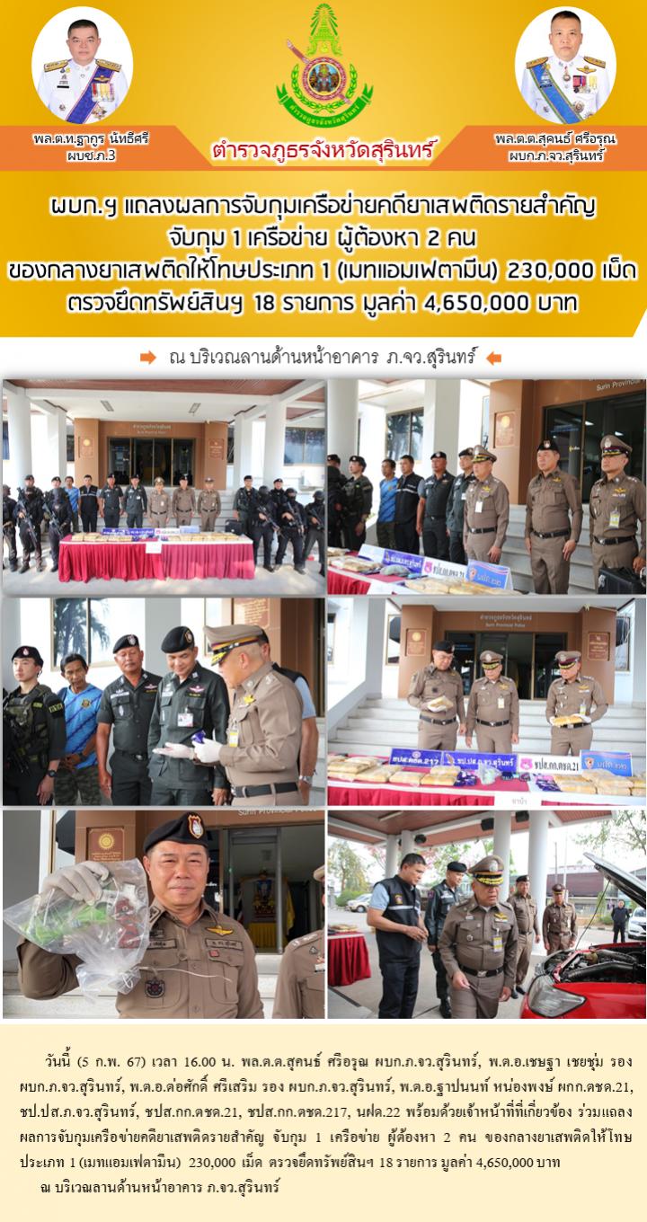 5 ก.พ. 2567 18:39:48ผบก.ฯ แถลงผลการจับกุมเครือข่ายคดียาเสพติดรายสำคัญ จับกุม 1 เครือข่าย ผู้ต้องหา 2 คน ของกลางยาเสพติดให้โทษประเภท 1 (เมทแอมเฟตามีน) 230,000 เม็ด ตรวจยึดทรัพย์สินฯ 18 รายการ มูลค่า 4,650,000 บาท วันนี้ (5 ก.พ. 67) เวลา 16.00 น. พล.ต.ต.สุคนธ์ ศรีอรุณ ผบก.ภ.จว.สุรินทร์, พ.ต.อ.เชษฐา เชยชุ่ม รอง ผบก.ภ.จ...
