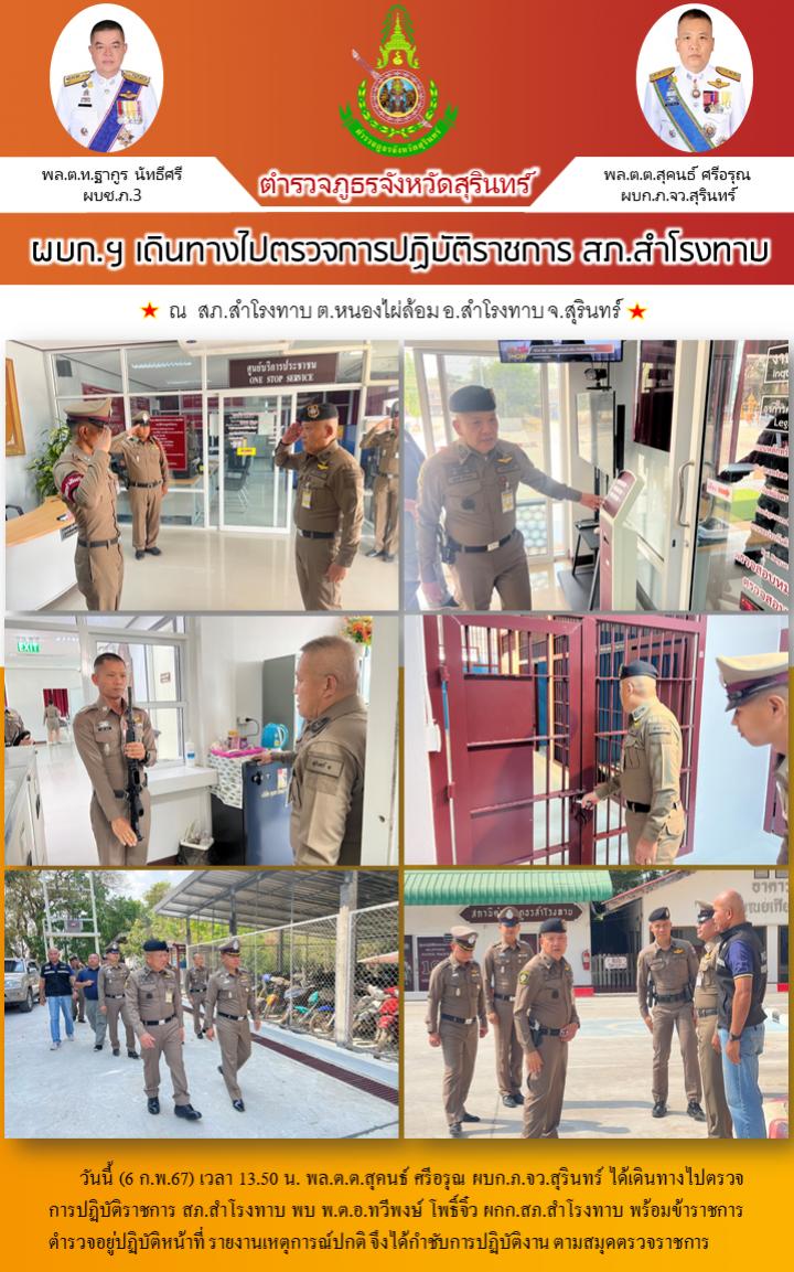 6 ก.พ. 2567 17:12:14ผบก.ฯ เดินทางไปตรวจการปฏิบัติราชการ สภ.สำโรงทาบ วันนี้ (6 ก.พ.67) เวลา 13.50 น. พล.ต.ต.สุคนธ์ ศรีอรุณ ผบก.ภ.จว.สุรินทร์ ได้เดินทางไปตรวจการปฏิบัติราชการ สภ.สำโรงทาบ พบ พ.ต.อ.ทวีพงษ์ โพธิ์จิ๋ว ผกก.สภ.สำโรงทาบ พร้อมข้าราชการตำรวจอยู่ปฏิบัติหน้าที่ รายงานเหตุการณ์ปกติ จึงได้กำชับการปฏิบัติงาน ตามสมุดต...
