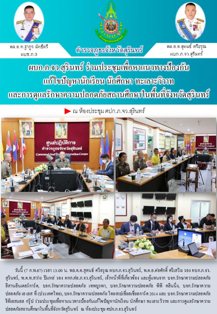 7 ก.พ. 2567 16:54:11ผบก.ภ.จว.สุรินทร์ ร่วมประชุมเพื่อหาแนวทางป้องกัน แก้ไขปัญหานักเรียน นักศึกษา ทะเลาะวิวาท และการดูแลรักษาความปลอดภัยสถานศึกษาในพื้นที่จังหวัดสุรินทร์ วันนี้ (7 ก.พ.67) เวลา 13.00 น. พล.ต.ต.สุคนธ์ ศรีอรุณ ผบก.ภ.จว.สุรินทร์, พ.ต.อ.ต่อศักดิ์ ศรีเสริม รอง ผบก.ภ.จว.สุรินทร์, พ.ต.ท.สว่าง ปีแหล่ รอง ผกก.ฝอ...