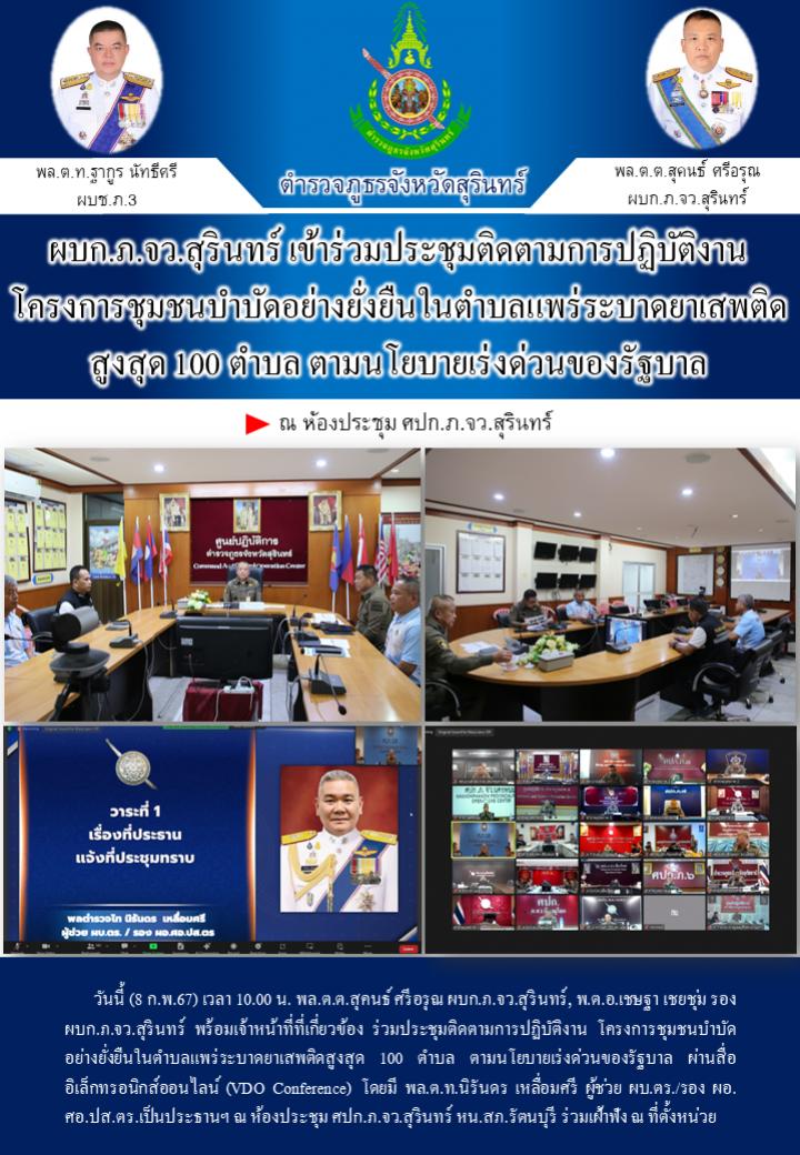 8 ก.พ. 2567 15:25:34 ผบก.ภ.จว.สุรินทร์ เข้าร่วมประชุมติดตามการปฏิบัติงานโครงการชุมชนบำบัดอย่างยั่งยืนในตำบลแพร่ระบาดยาเสพติดสูงสุด 100 ตำบล ตามนโยบายเร่งด่วนของรัฐบาล วันนี้ (8 ก.พ.67) เวลา 10.00 น. พล.ต.ต.สุคนธ์ ศรีอรุณ ผบก.ภ.จว.สุรินทร์, พ.ต.อ.เชษฐา เชยชุ่ม รอง ผบก.ภ.จว.สุรินทร์ พร้อมเจ้าหน้าที่ที่เกี่ยวข้อง ร...