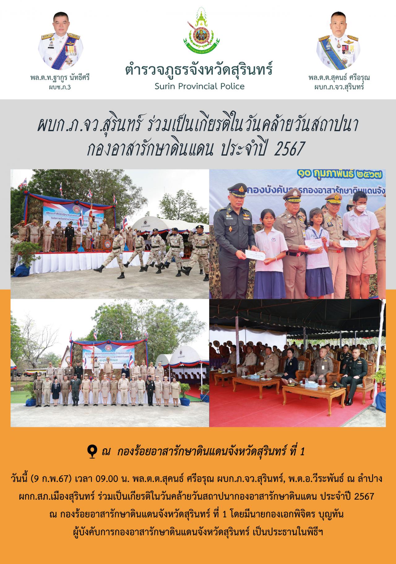 9 ก.พ. 2567 14:50:23ผบก.ภ.จว.สุรินทร์ ร่วมเป็นเกียรติในวันคล้ายวันสถาปนา กองอาสารักษาดินแดน ประจำปี 2567 วันนี้ (9 ก.พ.67) เวลา 09.00 น. พล.ต.ต.สุคนธ์ ศรีอรุณ ผบก.ภ.จว.สุรินทร์, พ.ต.อ.วีระพันธ์ ณ ลำปาง ผกก.สภ.เมืองสุรินทร์ ร่วมเป็นเกียรติในวันคล้ายวันสถาปนากองอาสารักษาดินแดน ประจำปี 2567 ณ กองร้อยอาสารักษาดินแดนจัง...