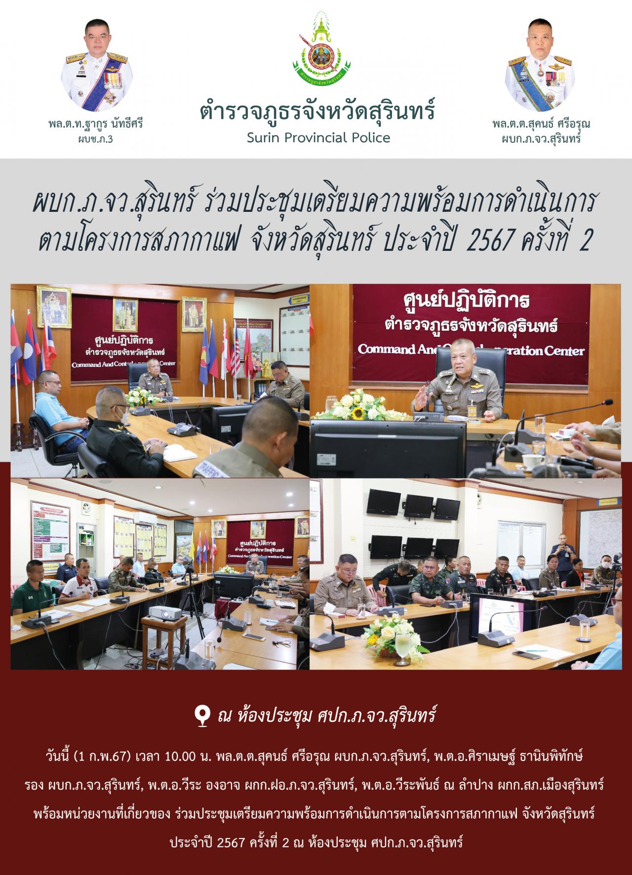 1 ก.พ. 2567 11:48:02ผบก.ภ.จว.สุรินทร์ ร่วมประชุมเตรียมความพร้อมการดำเนินการ ตามโครงการสภากาแฟ จังหวัดสุรินทร์ ประจำปี 2567 ครั้งที่ 2 วันนี้ (1 ก.พ.67) เวลา 10.00 น. พล.ต.ต.สุคนธ์ ศรีอรุณ ผบก.ภ.จว.สุรินทร์, พ.ต.อ.ศิราเมษฐ์ ธานินพิทักษ์ รอง ผบก.ภ.จว.สุรินทร์, พ.ต.อ.วีระ องอาจ ผกก.ฝอ.ภ.จว.สุรินทร์, พ.ต.อ.วีระพันธ์ ณ ลำ...