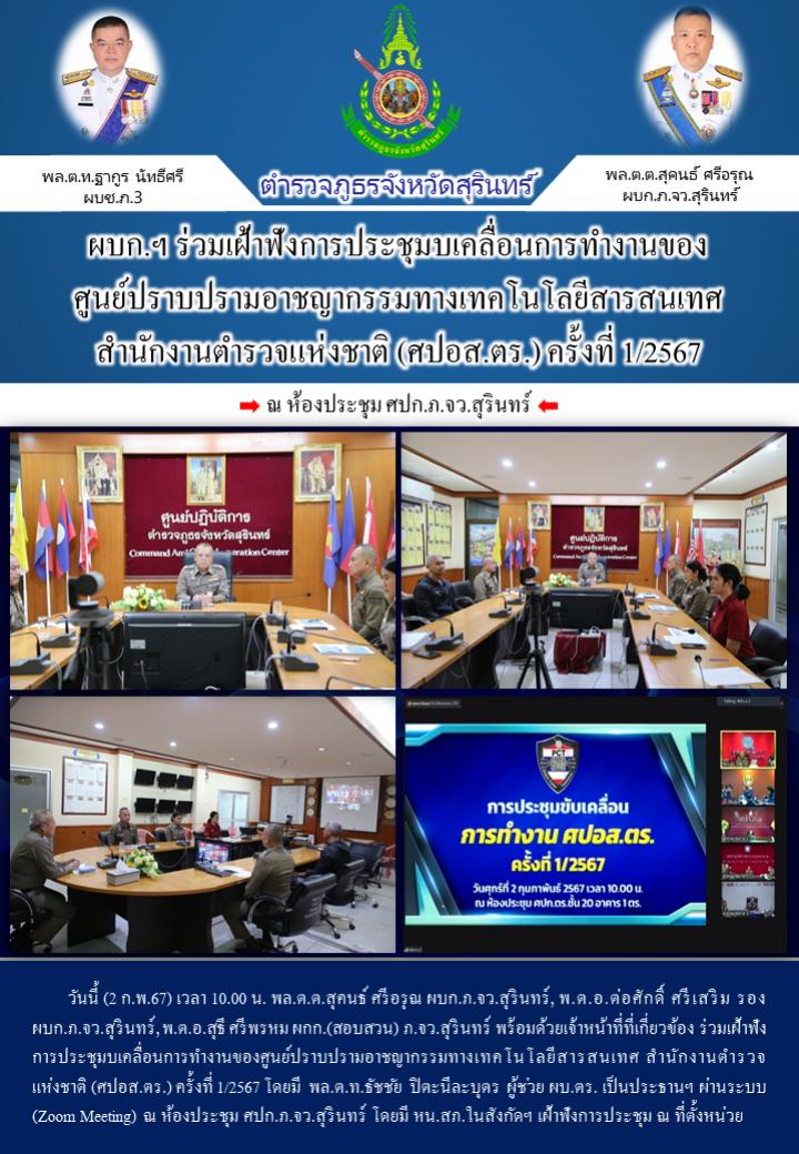 2 ก.พ. 2567 12:22:01ผบก.ฯ ร่วมเฝ้าฟังการประชุมบเคลื่อนการทำงานของ ศูนย์ปราบปรามอาชญากรรมทางเทคโนโลยีสารสนเทศ สำนักงานตำรวจแห่งชาติ (ศปอส.ตร.) ครั้งที่ 1/2567 วันนี้ (2 ก.พ.67) เวลา 10.00 น. พล.ต.ต.สุคนธ์ ศรีอรุณ ผบก.ภ.จว.สุรินทร์, พ.ต.อ.ต่อศักดิ์ ศรีเสริม รอง ผบก.ภ.จว.สุรินทร์, พ.ต.อ.สุธี ศรีพรหม ผกก.(สอบสวน) ...