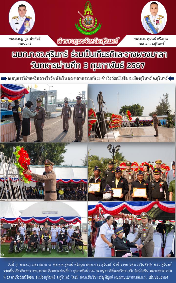 3 ก.พ. 2567 15:05:33 ผบก.ภ.จว.สุรินทร์ ร่วมเป็นเกียรติและวางพวงมาลา วันทหารผ่านศึก 3 กุมภาพันธ์ 2567 วันนี้ (3 ก.พ.67) เวลา 08.30 น. พล.ต.ต.สุคนธ์ ศรีอรุณ ผบก.ภ.จว.สุรินทร์ นำข้าราชการตำรวจในสังกัด ภ.จว.สุรินทร์ ร่วมเป็นเกียรติและวางพวงมาลาวันทหารผ่านศึก 3 กุมภาพันธ์ 2567 ณ อนุสาวรีย์พลตรีหลวงวีรวัฒน์โยธิน มณฑลทห...