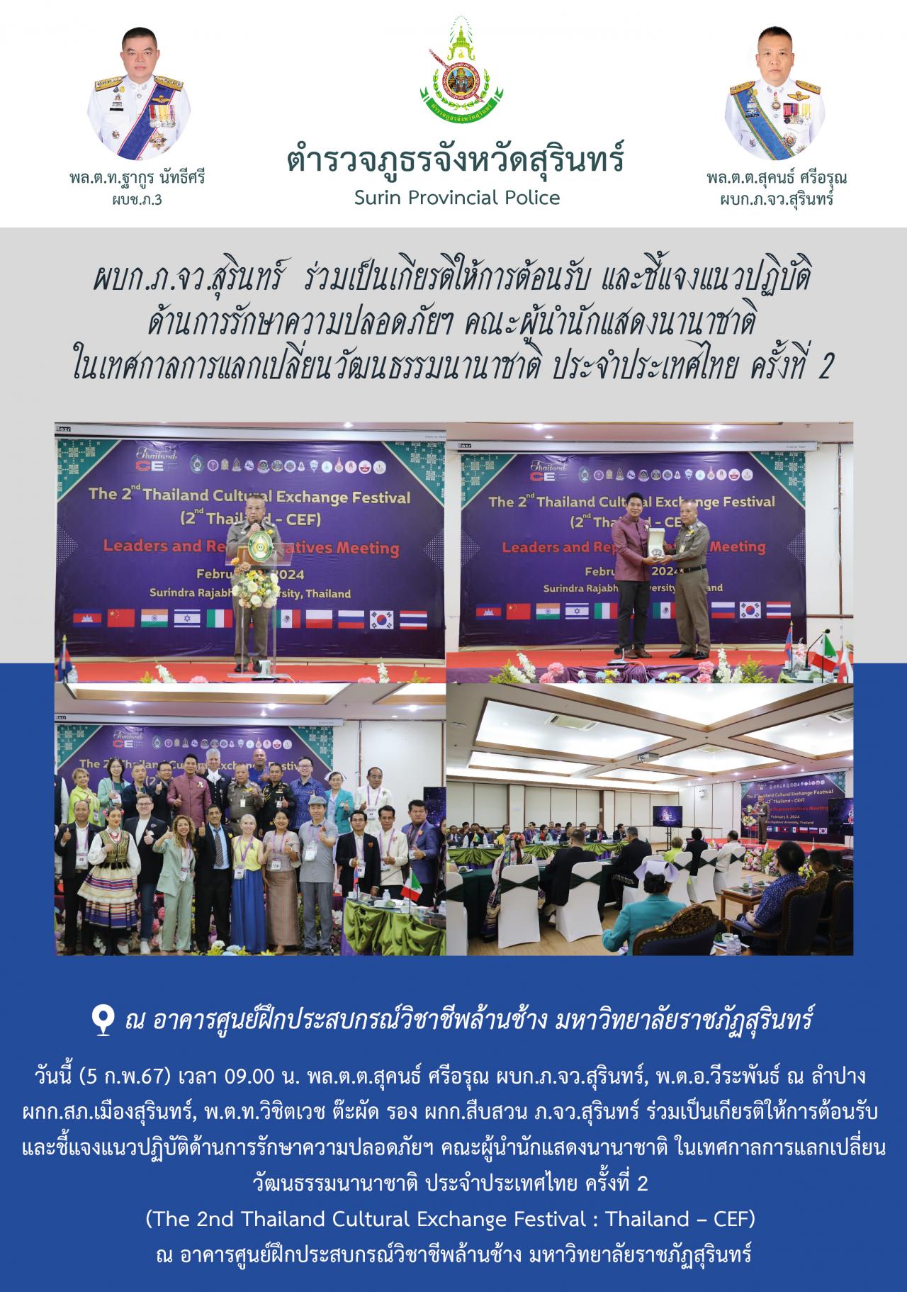 5 ก.พ. 2567 14:32:44ผบก.ภ.จว.สุรินทร์ ร่วมเป็นเกียรติให้การต้อนรับ และชี้แจงแนวปฏิบัติ ด้านการรักษาความปลอดภัยฯ คณะผู้นำนักแสดงนานาชาติ ในเทศกาลการแลกเปลี่ยนวัฒนธรรมนานาชาติ ประจำประเทศไทย ครั้งที่ 2 วันนี้ (5 ก.พ.67) เวลา 09.00 น. พล.ต.ต.สุคนธ์ ศรีอรุณ ผบก.ภ.จว.สุรินทร์, พ.ต.อ.วีระพันธ์ ณ ลำปาง ผกก.สภ.เมืองสุรินทร์...