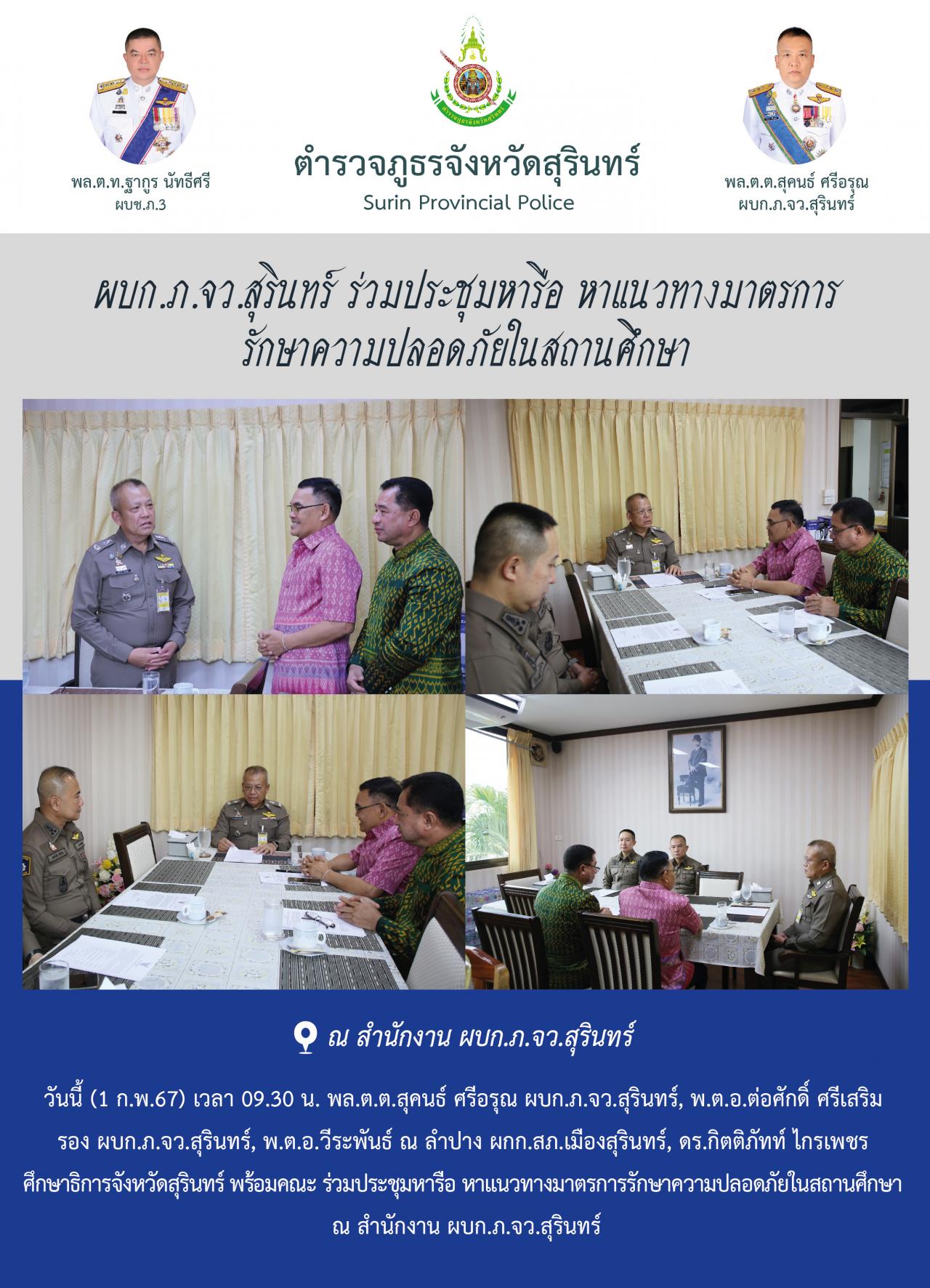 1 ก.พ. 2567 11:41:22ผบก.ภ.จว.สุรินทร์ ร่วมประชุมหารือ หาแนวทางมาตรการ รักษาความปลอดภัยในสถานศึกษา วันนี้ (1 ก.พ.67) เวลา 09.30 น. พล.ต.ต.สุคนธ์ ศรีอรุณ ผบก.ภ.จว.สุรินทร์, พ.ต.อ.ต่อศักดิ์ ศรีเสริม รอง ผบก.ภ.จว.สุรินทร์, พ.ต.อ.วีระพันธ์ ณ ลำปาง ผกก.สภ.เมืองสุรินทร์, ดร.กิตติภัทท์ ไกรเพชร ศึกษาธิการจังหวัดสุรินทร์ พร้อ...
