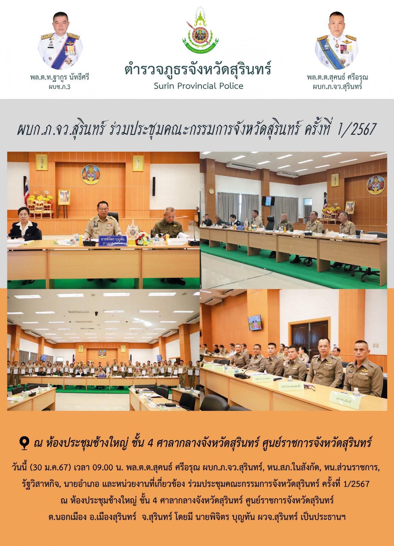 30 ม.ค. 2567 11:49:48ผบก.ภ.จว.สุรินทร์ ร่วมประชุมคณะกรรมการจังหวัดสุรินทร์ ครั้งที่ 1/2567 วันนี้ (30 ม.ค.67) เวลา 09.00 น. พล.ต.ต.สุคนธ์ ศรีอรุณ ผบก.ภ.จว.สุรินทร์, หน.สภ.ในสังกัด, หน.ส่วนราชการ, รัฐวิสาหกิจ, นายอำเภอ และหน่วยงานที่เกี่ยวข้อง ร่วมประชุมคณะกรรมการจังหวัดสุรินทร์ ครั้งที่ 1/2567 ณ ห้องประชุมช้างใหญ่ ชั...