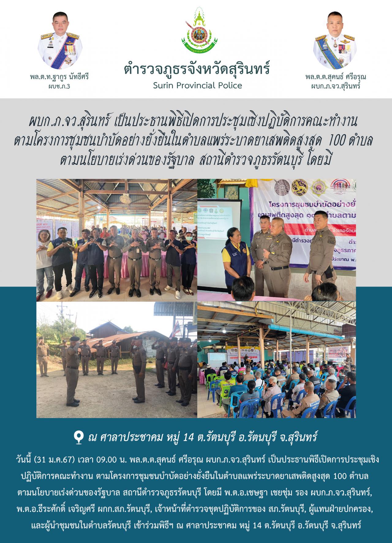 31 ม.ค. 2567 14:56:14ผบก.ภ.จว.สุรินทร์ เป็นประธานพิธีเปิดการประชุมเชิงปฏิบัติการคณะทำงาน ตามโครงการชุมชนบำบัดอย่างยั่งยืนในตำบลแพร่ระบาดยาเสพติดสูงสุด 100 ตำบล ตามนโยบายเร่งด่วนของรัฐบาล สถานีตำรวจภูธรรัตนบุรี โดยมี วันนี้ (31 ม.ค.67) เวลา 09.00 น. พล.ต.ต.สุคนธ์ ศรีอรุณ ผบก.ภ.จว.สุรินทร์ เป็นประธานพิธีเปิดการประชุมเ...