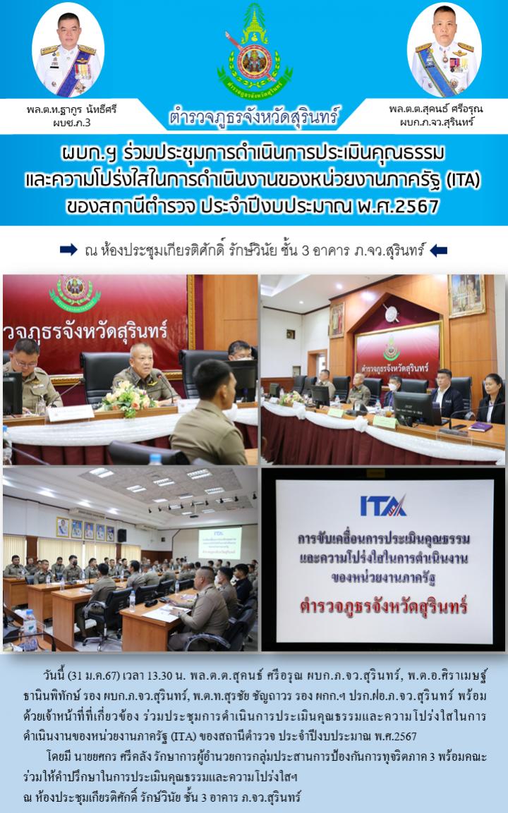 31 ม.ค. 2567 17:05:13 การประชุมการดำเนินการประเมินคุณธรรมและความโปร่งใสในการดำเนินงานของหน่วยงานภาครัฐ (ITA) ของสถานีตำรวจ ประจำปีงบประมาณ พ.ศ.2567 วันนี้ (31 ม.ค.67) เวลา 13.30 น. พล.ต.ต.สุคนธ์ ศรีอรุณ ผบก.ภ.จว.สุรินทร์, พ.ต.อ.ศิราเมษฐ์ ธานินพิทักษ์ รอง ผบก.ภ.จว.สุรินทร์, พ.ต.ท.สุรชัย ชัญถาวร รอง ผกก.ฯ ปรก.ฝอ.ภ.จว.สุ...