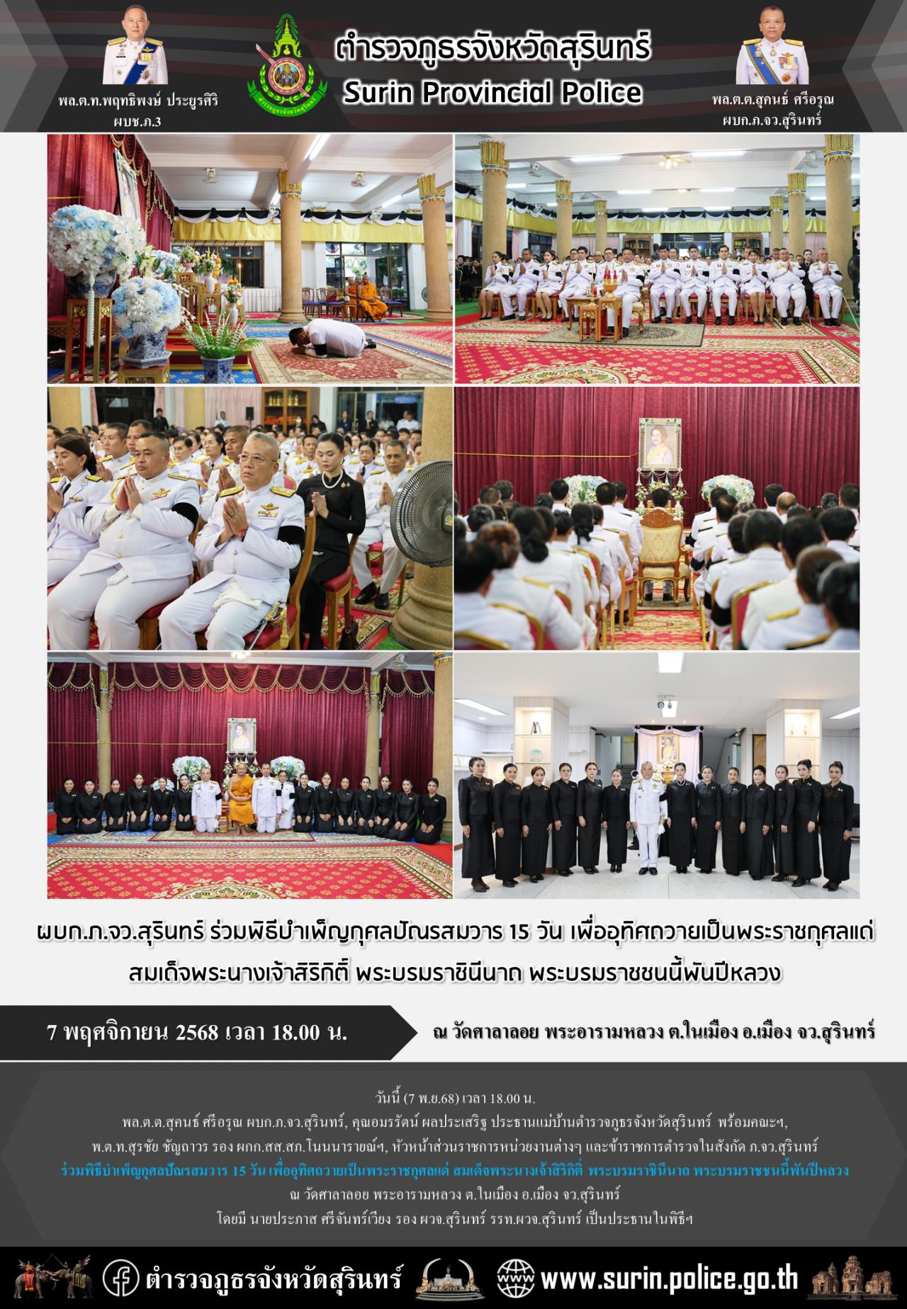 7 พ.ย. 2568 21:39:51ผบก.ภ.จว.สุรินทร์ ร่วมพิธีบำเพ็ญกุศลปัณรสมวาร 15 วัน เพื่ออุทิศถวายเป็นพระราชกุศลแด่ สมเด็จพระนางเจ้าสิริกิติ์ พระบรมราชินีนาถ พระบรมราชชนนี้พันปีหลวง วันนี้ (7 พ.ย.68) เวลา 18.00 น. พล.ต.ต.สุคนธ์ ศรีอรุณ ผบก.ภ.จว.สุรินทร์, คุณอมรรัตน์ ผลประเสริฐ ประธานแม่บ้านตำรวจภูธรจังหวัดสุรินทร์ พร้อมคณะฯ, ...