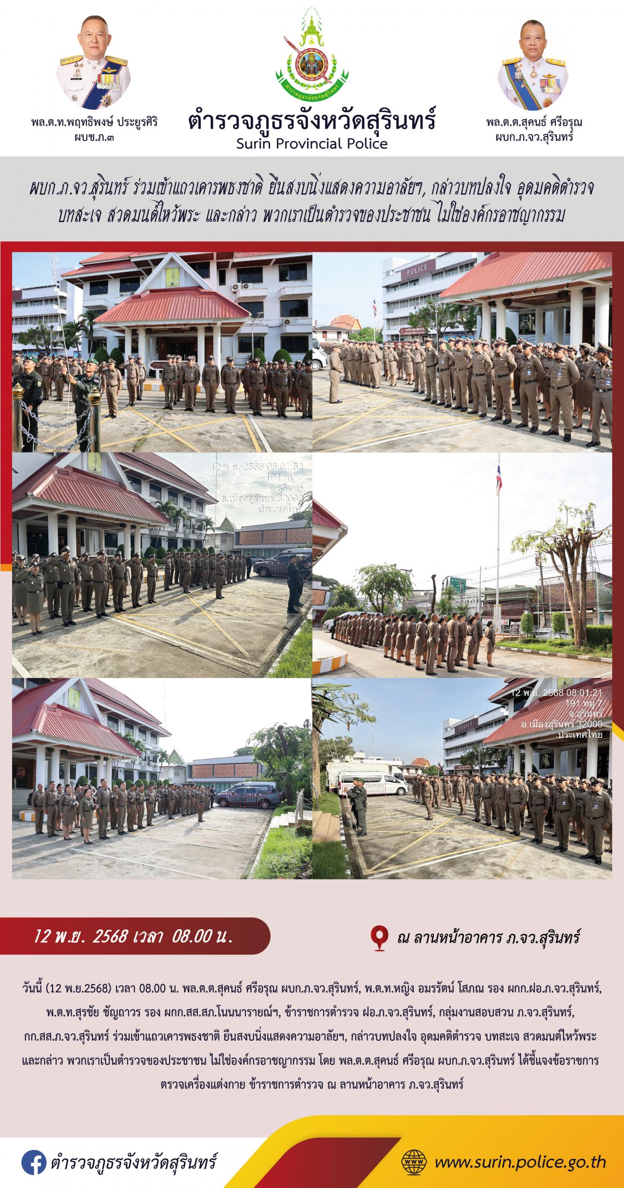 12 พ.ย. 2568 11:20:00ผบก.ภ.จว.สุรินทร์ ร่วมเข้าแถวเคารพธงชาติ ยืนสงบนิ่งแสดงความอาลัยฯ, กล่าวบทปลงใจ อุดมคติตำรวจ บทสะเจ สวดมนต์ไหว้พระ และกล่าว พวกเราเป็นตำรวจของประชาชน ไม่ใช่องค์กรอาชญากรรม วันนี้ (12 พ.ย.2568) เวลา 08.00 น. พล.ต.ต.สุคนธ์ ศรีอรุณ ผบก.ภ.จว.สุรินทร์, พ.ต.ท.หญิง อมรรัตน์ โสภณ รอง ผกก.ฝอ.ภ.จว.สุรินทร์,...