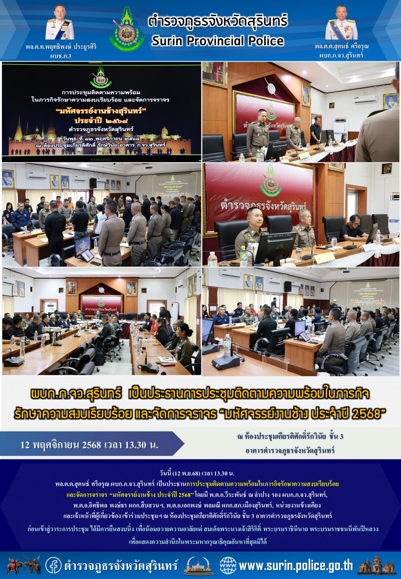 12 พ.ย. 2568 16:05:24วันนี้ (12 พ.ย.68) เวลา 13.30 น. พล.ต.ต.สุคนธ์ ศรีอรุณ ผบก.ภ.จว.สุรินทร์ เป็นประธานการประชุมติดตามความพร้อมในภารกิจรักษาความสงบเรียบร้อย และจัดการจราจร “มหัศจรรย์งานช้าง ประจำปี 2568” โดยมี พ.ต.อ.วีระพันธ์ ณ ลำปาง รอง ผบก.ภ.จว.สุรินทร์, พ.ต.อ.อิทธิพล พงษ์ธร ผกก.สืบสวนฯ, พ.ต.อ.เอกพงษ์ พลมณี ผกก.สภ...