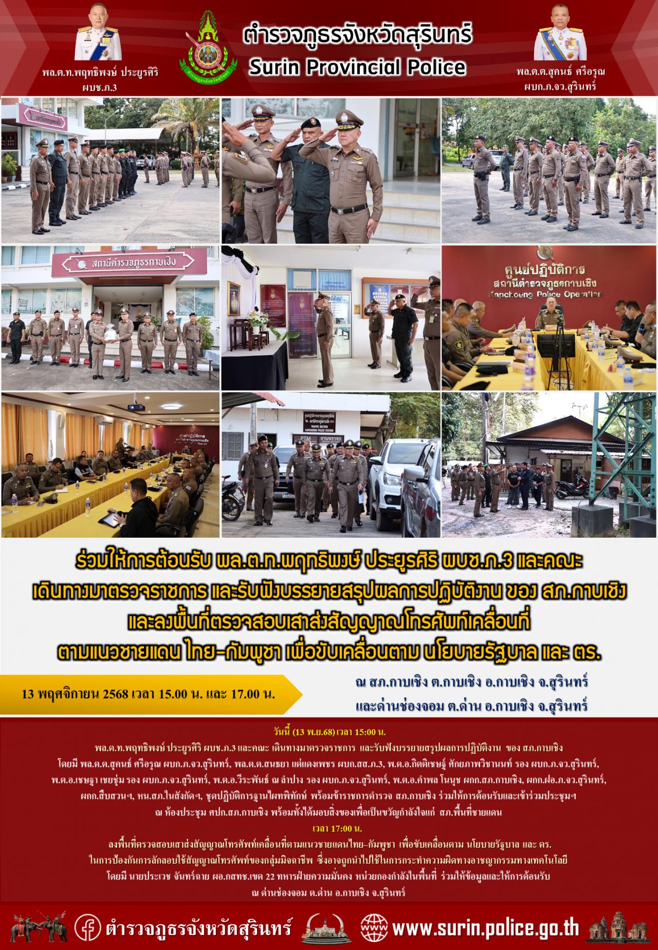13 พ.ย. 2568 23:19:54ร่วมให้การต้อนรับ พล.ต.ท.พฤทธิพงษ์ ประยูรศิริ ผบช.ภ.3 และคณะ เดินทางมาตรวจราชการ และรับฟังบรรยายสรุปผลการปฏิบัติงาน ของ สภ.กาบเชิง และลงพื้นที่ตรวจสอบเสาส่งสัญญาณโทรศัพท์เคลื่อนที่ตามแนวชายแดน ไทย–กัมพูชา เพื่อขับเคลื่อนตาม นโยบายรัฐบาล และ ตร. วันนี้ (13 พ.ย.68) เวลา 15:00 น. พล.ต.ท.พฤทธิพงษ์ ป...