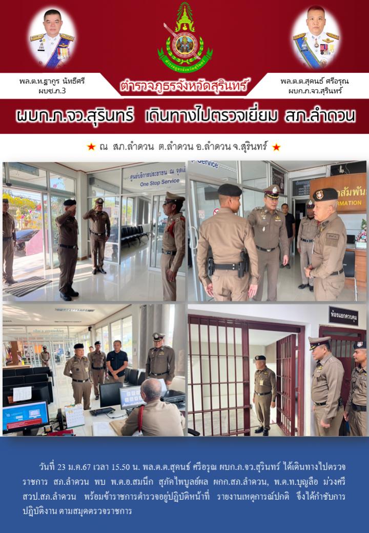24 ม.ค. 2567 09:29:40ผบก.ภ.จว.สุรินทร์ เดินทางไปตรวจเยี่ยม สภ.ลำดวน วันที่ 23 ม.ค.67 เวลา 15.50 น. พล.ต.ต.สุคนธ์ ศรีอรุณ ผบก.ภ.จว.สุรินทร์ ได้เดินทางไปตรวจราชการ สภ.ลำดวน พบ พ.ต.อ.สมนึก สุภัคไพบูลย์ผล ผกก.สภ.ลำดวน, พ.ต.ท.บุญลือ ม่วงศรี สวป.สภ.ลำดวน พร้อมข้าราชการตำรวจอยู่ปฏิบัติหน้าที่ รายงานเหตุการณ์ปกติ จึงไ...