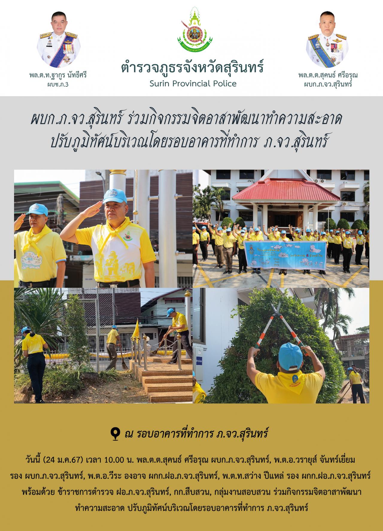 24 ม.ค. 2567 13:14:20ผบก.ภ.จว.สุรินทร์ ร่วมกิจกรรมจิตอาสาพัฒนาทำความสะอาด ปรับภูมิทัศน์บริเวณโดยรอบอาคารที่ทำการ ภ.จว.สุรินทร์ วันนี้ (24 ม.ค.67) เวลา 10.00 น. พล.ต.ต.สุคนธ์ ศรีอรุณ ผบก.ภ.จว.สุรินทร์, พ.ต.อ.วรายุส์ จันทร์เยี่ยม รอง ผบก.ภ.จว.สุรินทร์, พ.ต.อ.วีระ องอาจ ผกก.ฝอ.ภ.จว.สุรินทร์, พ.ต.ท.สว่าง ปีแหล่ รอง ผกก.ฝ...