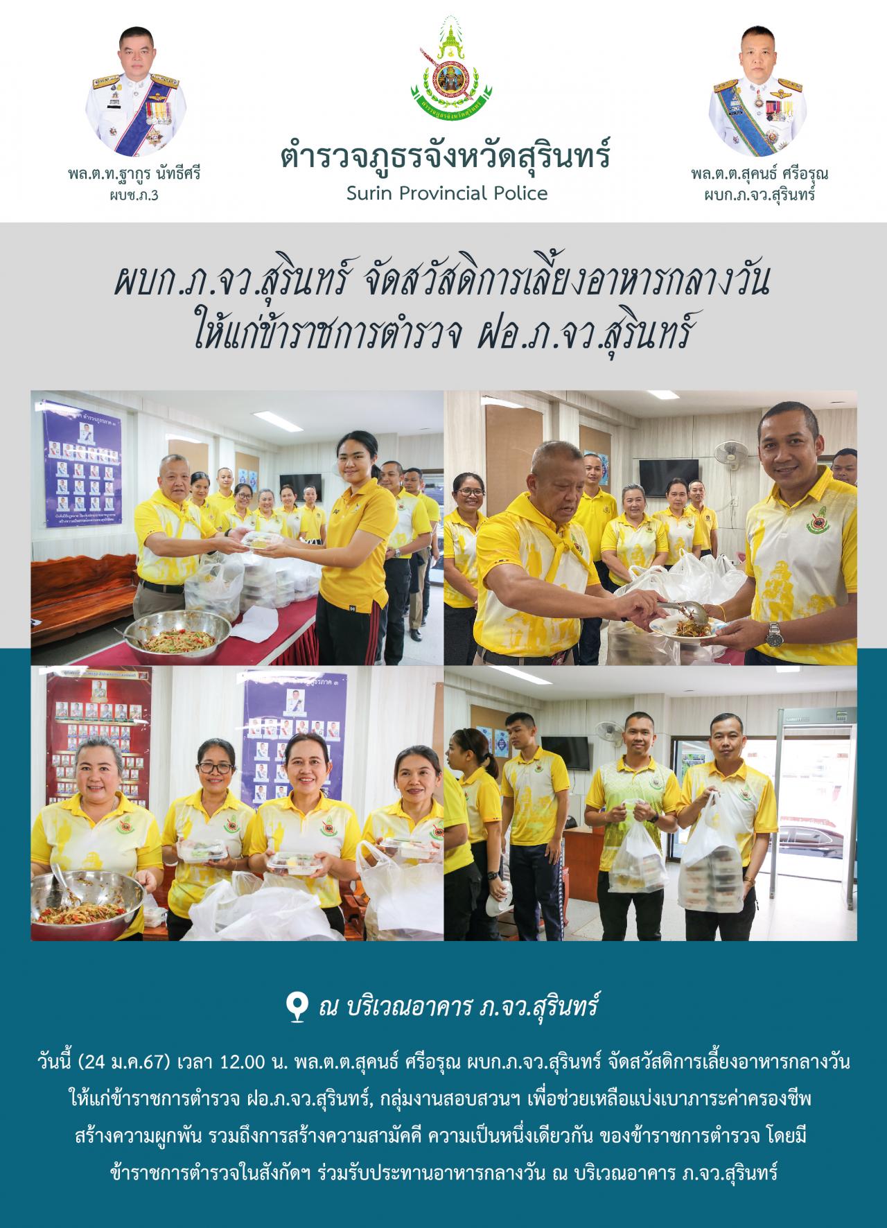 24 ม.ค. 2567 13:21:51ผบก.ภ.จว.สุรินทร์ จัดสวัสดิการเลี้ยงอาหารกลางวัน ให้แก่ข้าราชการตำรวจ ฝอ.ภ.จว.สุรินทร์ วันนี้ (24 ม.ค.67) เวลา 12.00 น. พล.ต.ต.สุคนธ์ ศรีอรุณ ผบก.ภ.จว.สุรินทร์ จัดสวัสดิการเลี้ยงอาหารกลางวัน ให้แก่ข้าราชการตำรวจ ฝอ.ภ.จว.สุรินทร์, กลุ่มงานสอบสวนฯ เพื่อช่วยเหลือแบ่งเบาภาระค่าครองชีพ สร้างความผูกพัน ...
