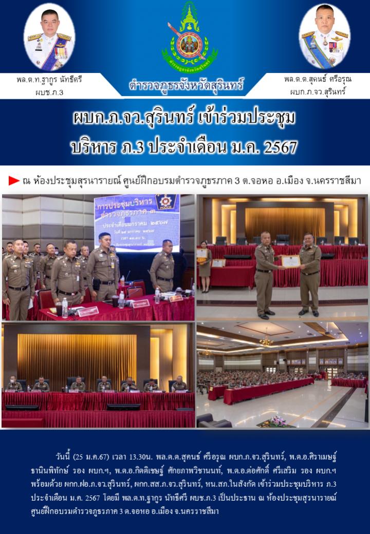 25 ม.ค. 2567 16:34:21 เข้าร่วมประชุมบริหาร ภ.3 ประจำเดือน ม.ค. 2567 วันนี้ (25 ม.ค.67) เวลา 13.30น. พล.ต.ต.สุคนธ์ ศรีอรุณ ผบก.ภ.จว.สุรินทร์, พ.ต.อ.ศิราเมษฐ์ ธานินพิทักษ์ รอง ผบก.ฯ, พ.ต.อ.กิตติเชษฐ์ ศักยภาพวิชานนท์, พ.ต.อ.ต่อศักดิ์ ศรีเสริม รอง ผบก.ฯ พร้อมด้วย ผกก.ฝอ.ภ.จว.สุรินทร์, ผกก.สส.ภ.จว.สุรินทร์, หน.สภ.ในสังกัด เ...