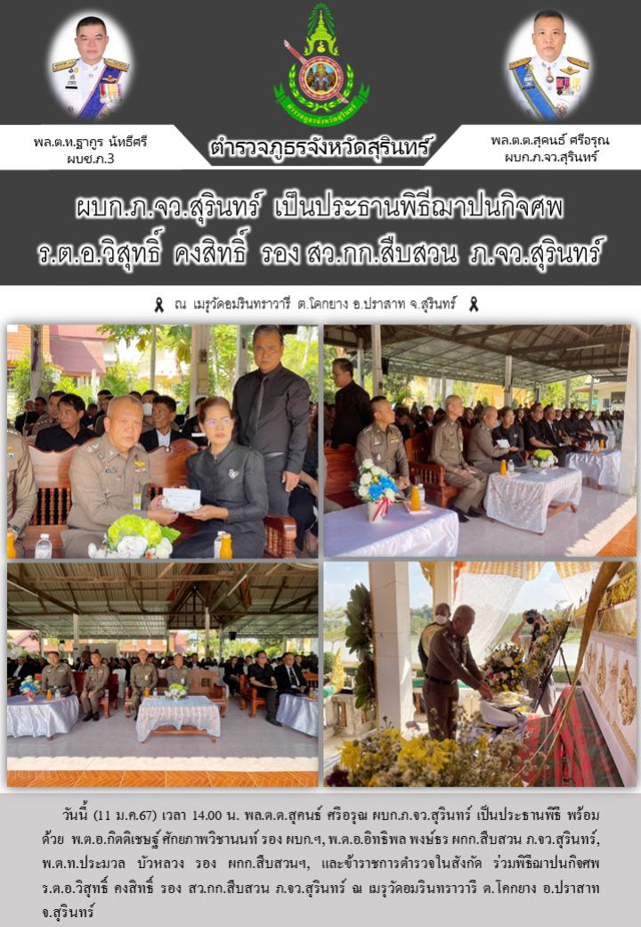 11 ม.ค. 2567 18:38:52ผบก.ภ.จว.สุรินทร์ เป็นประธานพิธีฌาปนกิจศพ ร.ต.อ.วิสุทธิ์ คงสิทธิ์ รอง สว.กก.สืบสวน ภ.จว.สุรินทร์ วันนี้ (11 ม.ค.67) เวลา 14.00 น. พล.ต.ต.สุคนธ์ ศรีอรุณ ผบก.ภ.จว.สุรินทร์ เป็นประธานพิธี พร้อมด้วย พ.ต.อ.กิตติเชษฐ์ ศักยภาพวิชานนท์ รอง ผบก.ฯ, พ.ต.อ.อิทธิพล พงษ์ธร ผกก.สืบสวน ภ.จว.สุรินทร์, พ.ต.ท...