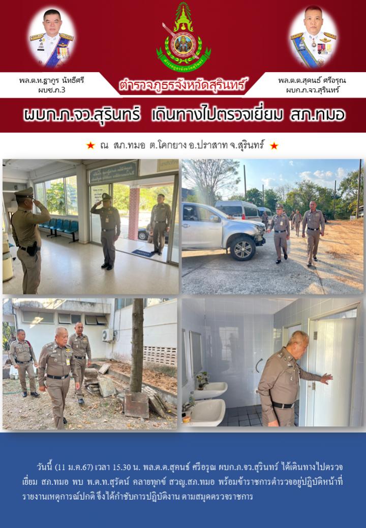 11 ม.ค. 2567 18:38:57ผบก.ภ.จว.สุรินทร์ เดินทางไปตรวจเยี่ยม สภ.ทมอ วันนี้ (11 ม.ค.67) เวลา 15.30 น. พล.ต.ต.สุคนธ์ ศรีอรุณ ผบก.ภ.จว.สุรินทร์ ได้เดินทางไปตรวจเยี่ยม สภ.ทมอ พบ พ.ต.ท.สุรัตน์ คลายทุกข์ สวญ.สภ.ทมอ พร้อมข้าราชการตำรวจอยู่ปฏิบัติหน้าที่ รายงานเหตุการณ์ปกติ จึงได้กำชับการปฏิบัติงาน ตามสมุดตรวจราชการ ...